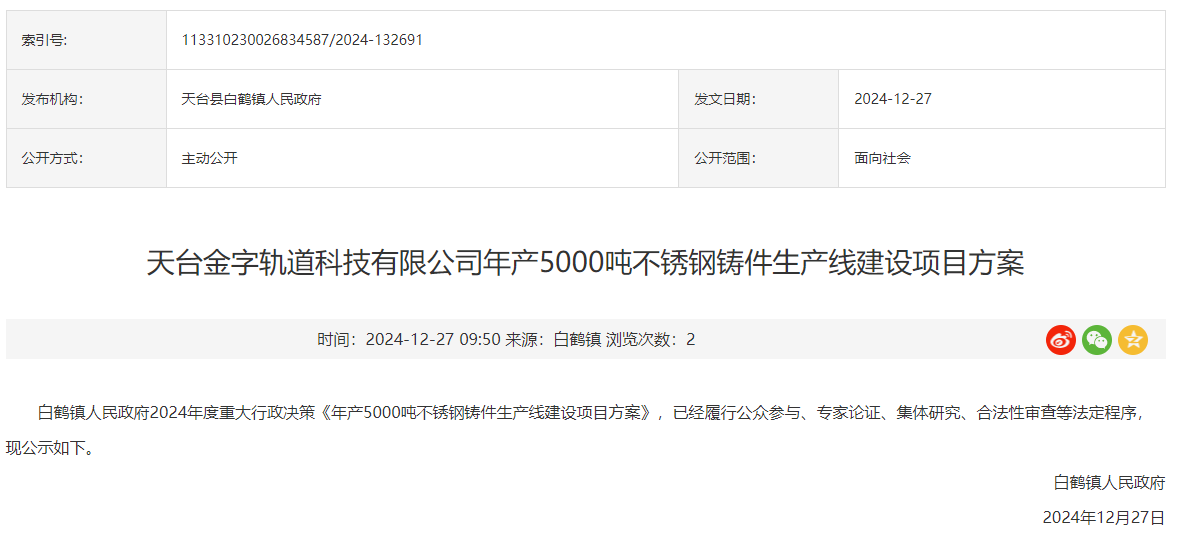 2024年12月27日,白鶴鎮(zhèn)人民政府就天臺金字軌道科技有限公司年產(chǎn)5000噸不銹鋼鑄件生產(chǎn)線建設(shè)項目方案對外進行公示。